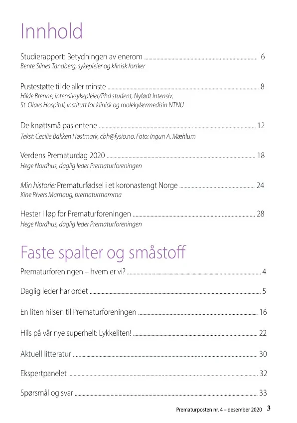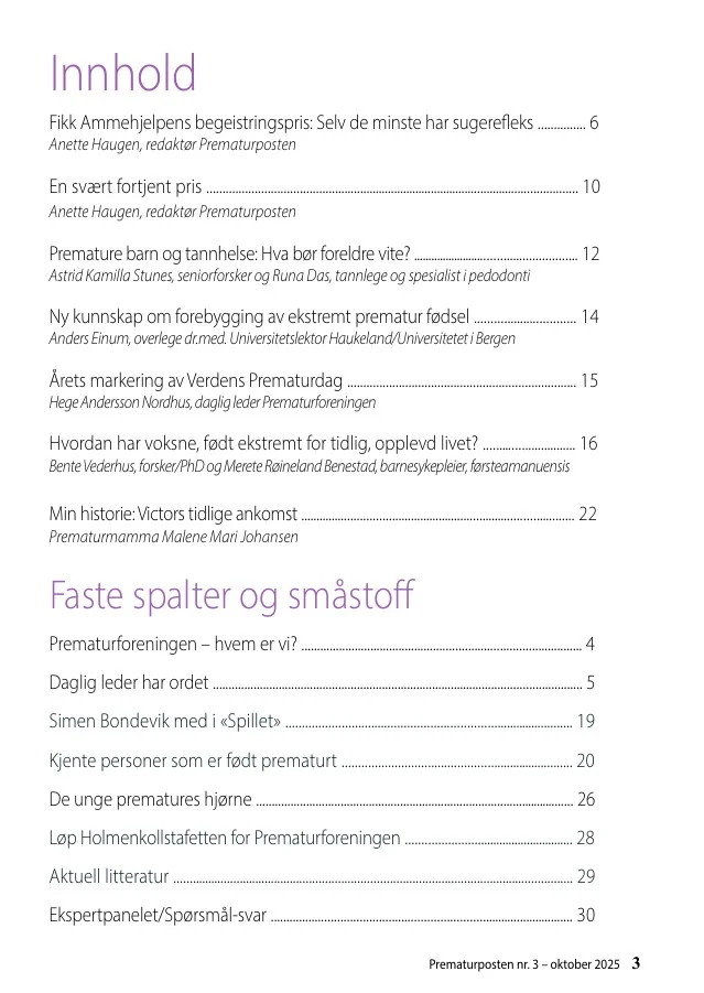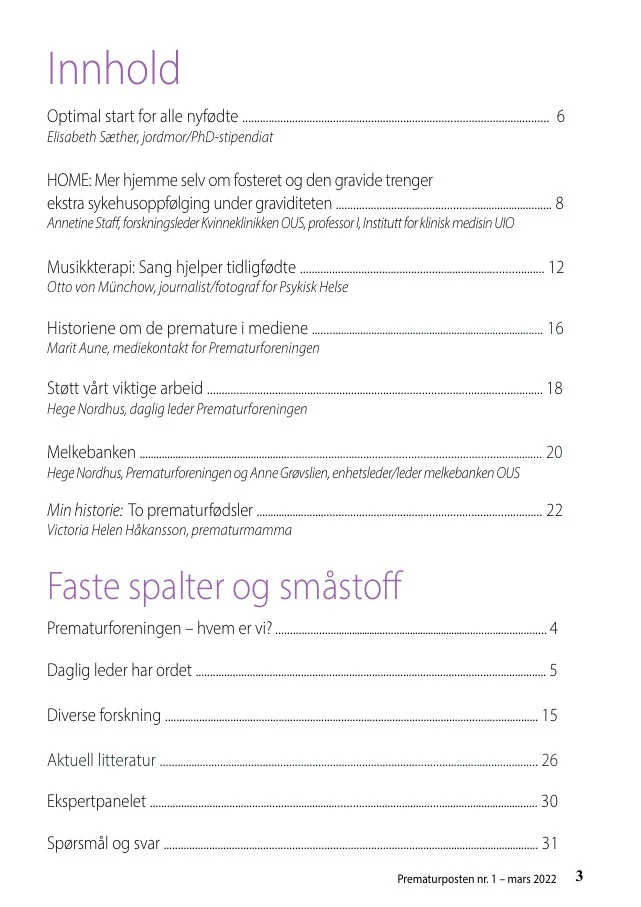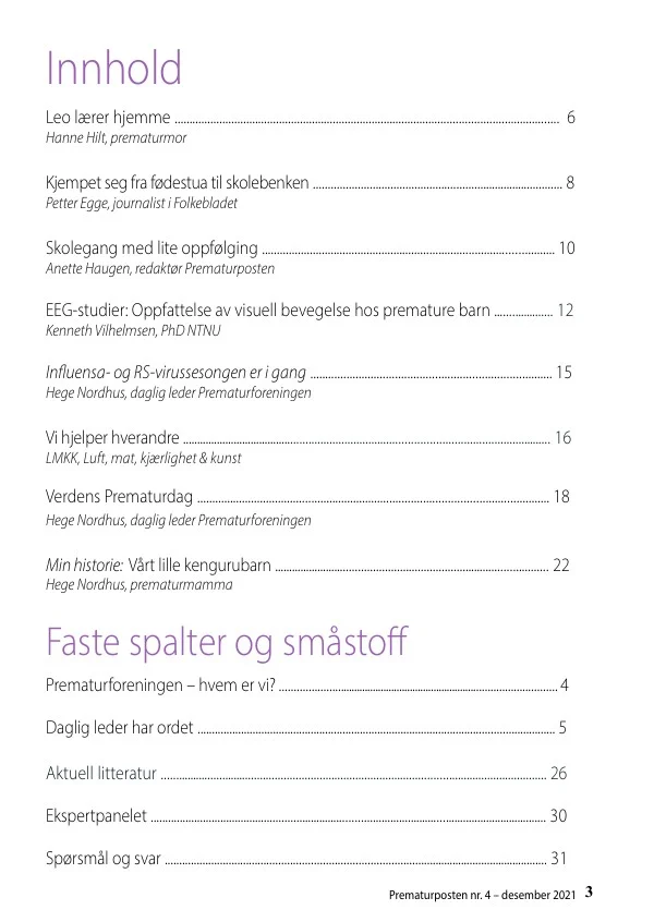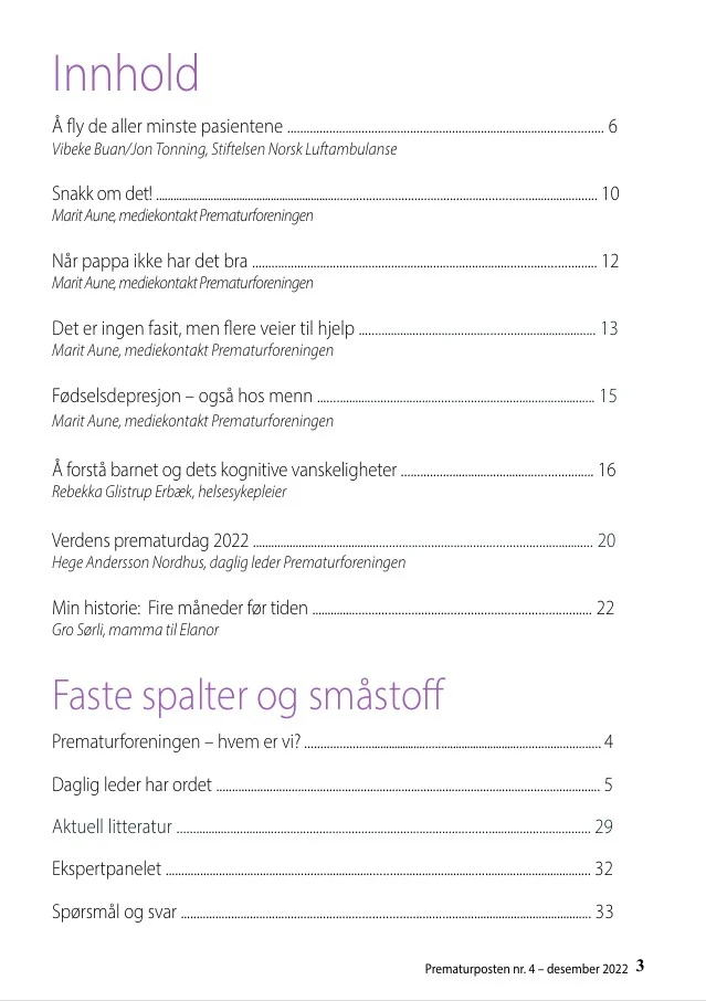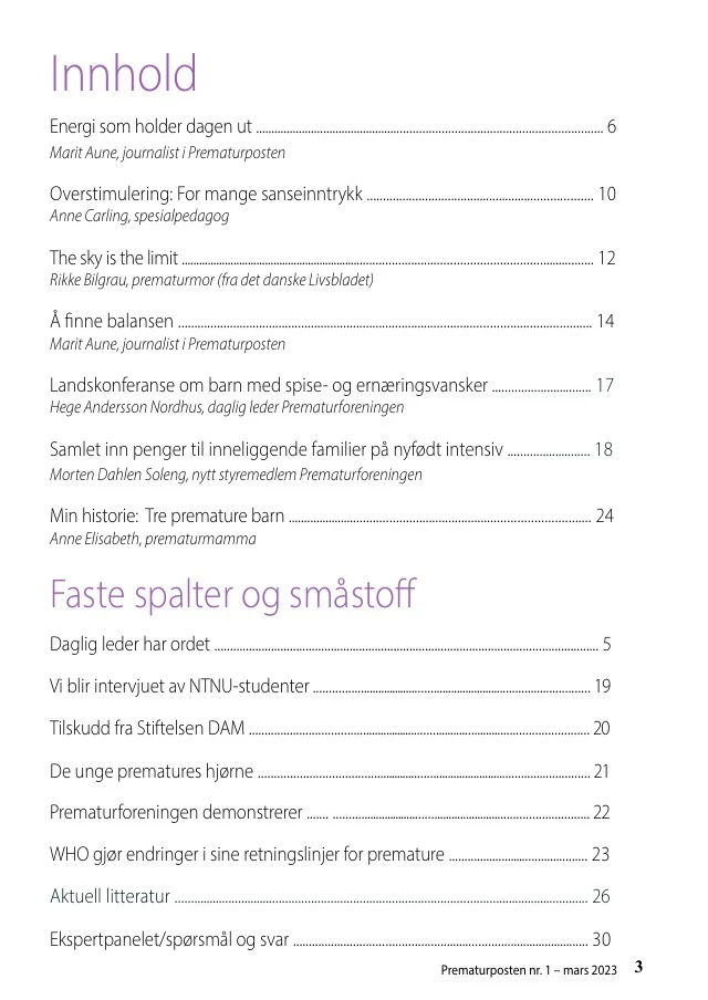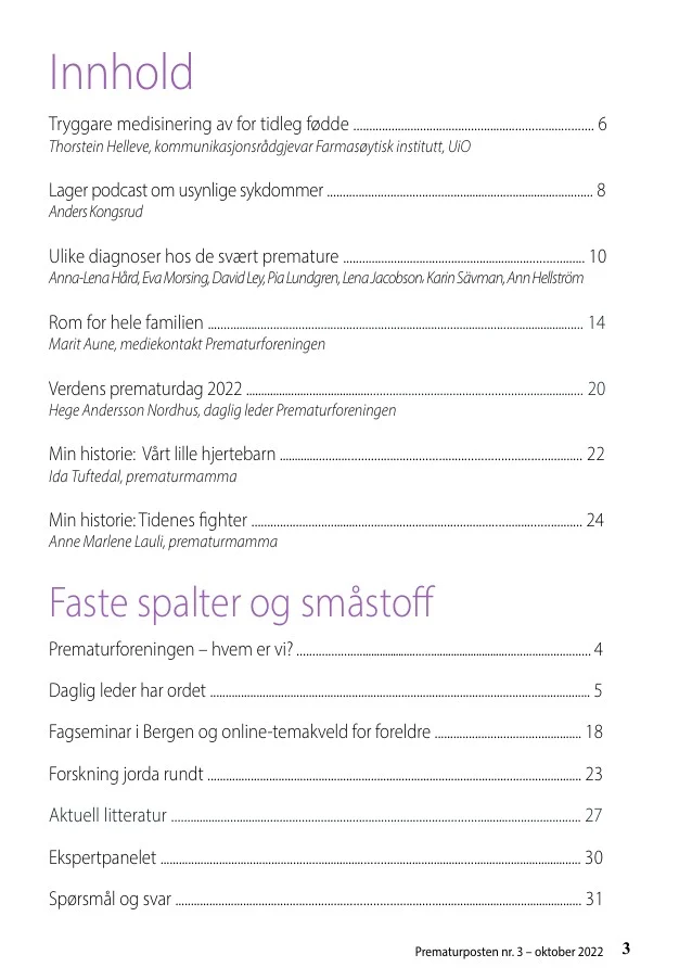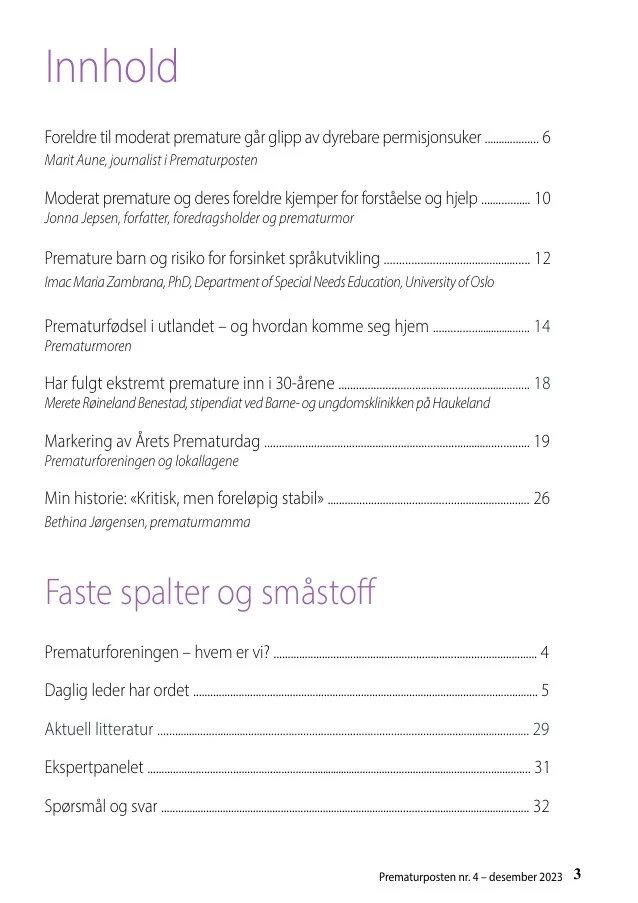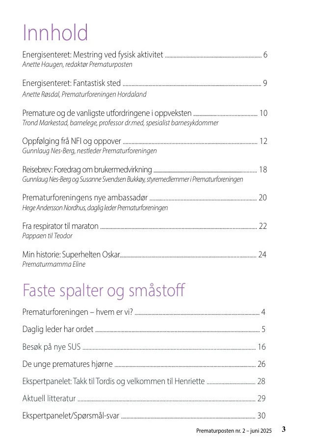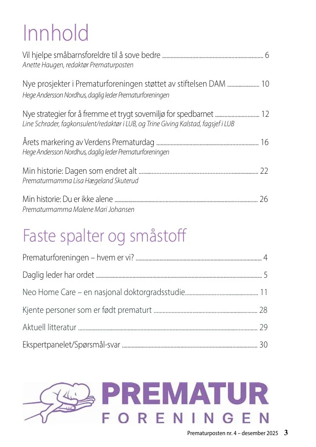 Prematurposten er vårt medlemsblad, der vi deler historier, kunnskap og nyheter om prematuritet. Her finner du faglige oppdateringer, personlige erfaringer og informasjon om foreningens arbeid – samlet for å støtte og styrke foreldre til premature barn.